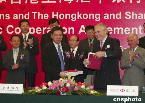 中新社北京八月六日電(記者李鵬)中國最大的股份制商業(yè)銀行交通銀行六日與香港上海匯豐銀行在北京簽署戰(zhàn)略合作協(xié)議。匯豐銀行以現(xiàn)金入股交通銀行,入股比例為百分之十九點(diǎn)九,接近銀監(jiān)會規(guī)定的百分之二十上限,這是迄今為止國際著名金融機(jī)構(gòu)入股中國商業(yè)銀行的最大宗交易。