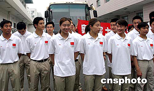 8月8日,中國奧運軍團從北京出征2004雅典奧運會,中國跳水隊在北京集合準備出發(fā)奔赴雅典奧運會賽場。中新社記者:盛佳鵬