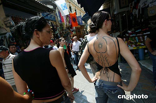 一位希臘美女在雅典街頭身穿露背裝展示美背體繪,吸引路人眼球。中新社記者:王瑤