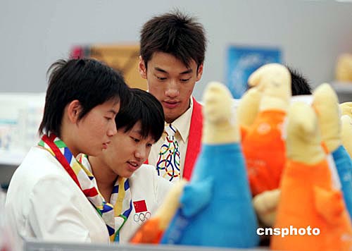 當(dāng)?shù)貢r間八月九日上午,參加雅典奧運會的中國代表團女子游泳小將江文菁(中)等利用賽前閑暇時間,在奧運選手村逛商店,在琳瑯滿目的奧運吉祥物紀(jì)念品前駐足留連。中新社記者:毛建軍