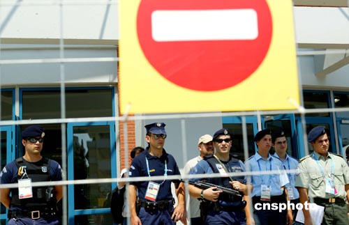當(dāng)?shù)貢r間八月九日在希臘雅典奧運會主新聞中心前,全副武裝的軍警一步一崗,以確保各國記者安全。中新社記者:王瑤