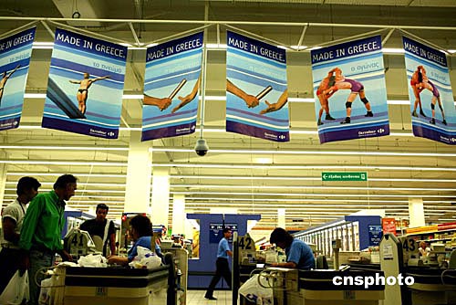 奧運(yùn)會(huì)開(kāi)幕在即,希臘雅典的商家們借奧運(yùn)東風(fēng)開(kāi)展促銷,家樂(lè)福超市里掛滿體育彩旗,宣傳推介當(dāng)?shù)爻霎a(chǎn)的日用品。中新社記者:王瑤
