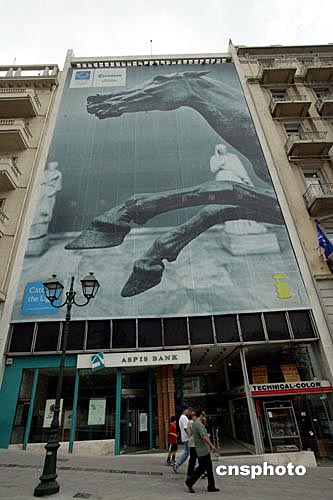 在希臘雅典市中心街頭,一幅數(shù)層樓高的宣傳畫以其獨具匠心的設(shè)計引人注目。中新社記者:王瑤