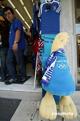 奧運(yùn)會(huì)吉祥物雅典娜在雅典旅游紀(jì)念品商店前笑臉迎賓,店內(nèi)顧客盈門,生意紅火。中新社記者:王瑤