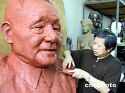 由上海市著名雕塑家唐世儲創(chuàng)作的鄧小平晚年塑像已經基本完成。據悉,該塑像高和寬各達九十公分,重約七、八百斤,將于近期在上海市紀念鄧小平誕辰百年的藝術展上展出。八月十日,唐世儲在工作室里為塑像作最后的修補與加工。作者:上海分社