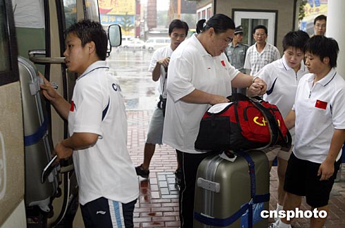 8月12日,中國(guó)舉重隊(duì)的重量級(jí)選手唐功紅在中國(guó)國(guó)家體育總局訓(xùn)練局收拾行囊出征雅典奧運(yùn)會(huì)。中國(guó)舉重隊(duì)第二批隊(duì)員是日出發(fā)雅典。中新社記者:盛佳鵬