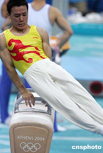 中國(guó)男子體操隊(duì)于當(dāng)?shù)貢r(shí)間八月十一日晚在雅典奧運(yùn)體操比賽館進(jìn)行實(shí)地訓(xùn)練,圖為黃旭正在進(jìn)行鞍馬的認(rèn)真訓(xùn)練。中新社記者:毛建軍