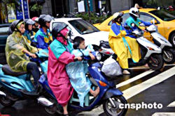 臺風“云娜”八月十二日掠過北臺灣,給臺北市帶來風和雨。圖為騎摩托車的民眾身穿雨衣抵擋風雨。中新社記者:董會峰