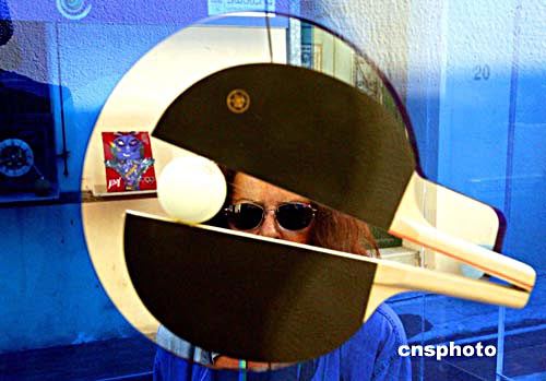 奧運(yùn)開(kāi)幕前,在雅典市中心的奧運(yùn)主題一條街上,一名游客正仔細(xì)觀看作為藝術(shù)品陳列的乒乓球拍。中新社記者:王瑤