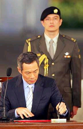 李顯龍總理在宣誓書上簽字,新加坡總統(tǒng)納丹也在宣誓書上簽字。接著,納丹總統(tǒng)把委任狀交給新任總理李顯龍,正式宣布李顯龍出任新加坡第三任總理。李總理的夫人何晶和子女也出席了當(dāng)晚的就職典禮。
