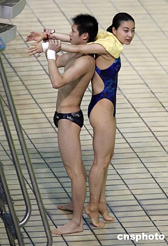 雅典時間八月十二日下午,中國女子跳水名將郭晶晶在隊友的幫助下進行奧運賽前訓練的準備活動。中新社記者:毛建軍