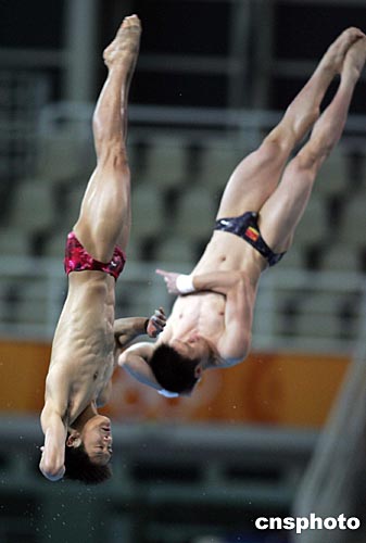 中國跳水隊隊員田亮、楊景輝當?shù)貢r間八月十二日下午在雅典進行賽前訓(xùn)練,他們將在十四日開始的奧運首日賽事中角逐男子十米跳臺雙人金牌。中新社記者:毛建軍