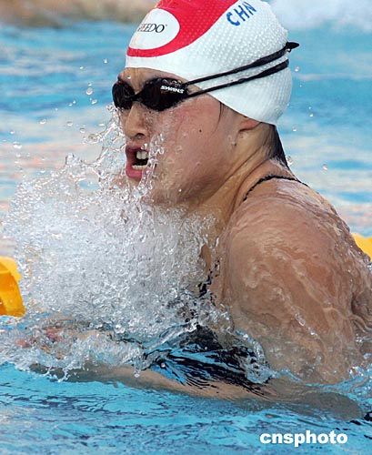中國游泳名將羅雪娟當(dāng)?shù)貢r(shí)間八月十二日下午在雅典奧運(yùn)賽場(chǎng)進(jìn)行賽前訓(xùn)練。中新社記者:毛建軍