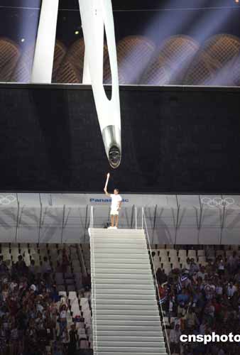 首次實(shí)現(xiàn)了真正意義上的全球傳遞的奧運(yùn)圣火被傳遞到最后一名火炬手——希臘帆船世界冠軍科納馬納斯基手中,他用手中的小火炬點(diǎn)燃了紡錘形的主火炬,火炬臺(tái)慢慢回立至高空,奧運(yùn)圣火在奧林匹克發(fā)源地熊熊燃起,光耀全球。