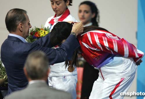 當(dāng)?shù)貢r間八月十四日中午,二十二歲的中國女神槍手杜麗(中)在雅典奧運(yùn)會女子十米氣步槍比賽中最后一槍后來居上獲得冠軍,為中國軍團(tuán)獲得本屆奧運(yùn)會第一枚金牌,這也是本屆奧運(yùn)會首枚金牌。中新社記者:任晨鳴