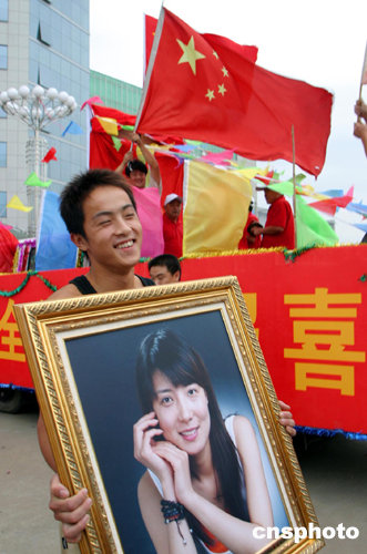 八月十四日十六點三十分,在雅典奧運(yùn)會女子十米氣步槍決賽中,山東籍選手杜麗奪得奧運(yùn)會第一枚金牌。喜訊傳來,曾經(jīng)培養(yǎng)過她的山東省競技體育學(xué)校的師生們揮舞著國旗歡呼慶祝。作者:王鋒