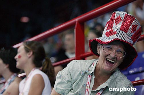 八月十四日,在首日奧運會女子羽毛球賽場上,加拿大忠實的球迷奶奶頭戴楓葉帽,為本國選手助威。中新社記者:王瑤
