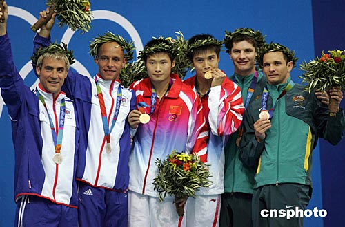 當(dāng)?shù)貢r間八月十四日晚,中國跳水隊田亮、楊景輝在雅典奧運跳水館獲得男子雙人十米跳臺金牌。中新社記者:毛建軍