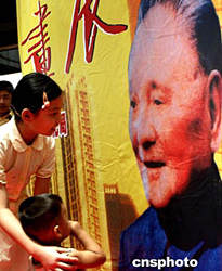 八月十五日在深圳舉辦的朱繼峰紀念鄧小平誕辰一百周年書畫展上,兩位小朋友在鄧小平畫像前。對鄧小平有特殊感情的深圳人目前正采取多種形式紀念這位偉人。中新社記者:宋吉河