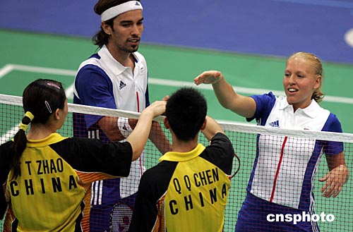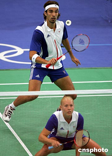 英國參加雅典奧運會羽毛球混合雙打的羅伯遜、埃姆斯,當(dāng)?shù)貢r間8月16日以2比0選手戰(zhàn)勝中國選手陳其遒、趙婷婷,進(jìn)入前四名。