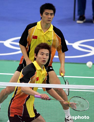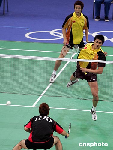 當地時間八月十六日,參加雅典奧運會男子羽毛球雙打比賽的中國選手蔡赟、付海峰,以2:1戰(zhàn)勝日本選手,與另一對中國選手攜手進入前八名。中新社記者:任晨鳴