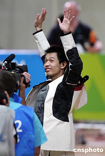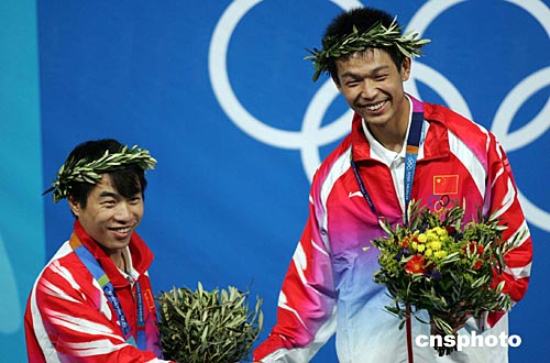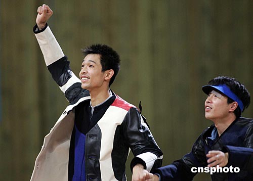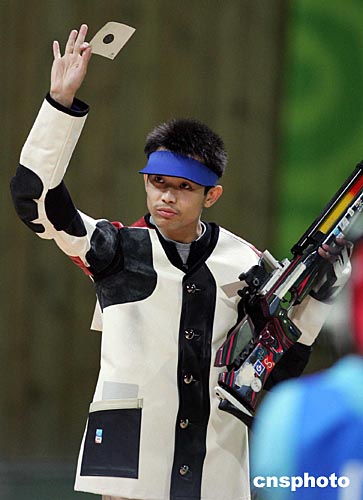 當(dāng)?shù)貢r(shí)間八月十六日,中國(guó)選手朱啟南(左)與李杰在雅典奧運(yùn)男子十米氣步槍射擊比賽中分獲金、銀牌。朱啟南并以七百零二環(huán)的成績(jī)打破世界紀(jì)錄。中新社記者:毛建軍