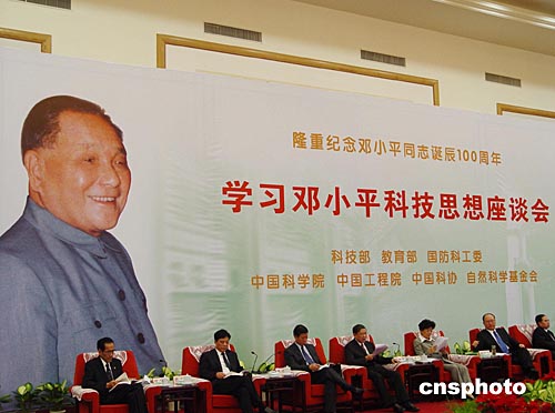 八月十六日下午,中國科學(xué)技術(shù)部、教育部、國防科學(xué)技術(shù)工業(yè)委員會等七家部委級單位在北京共同舉行學(xué)習(xí)鄧小平科技思想座談會,紀(jì)念鄧小平百年誕辰。中新社記者:孫自法