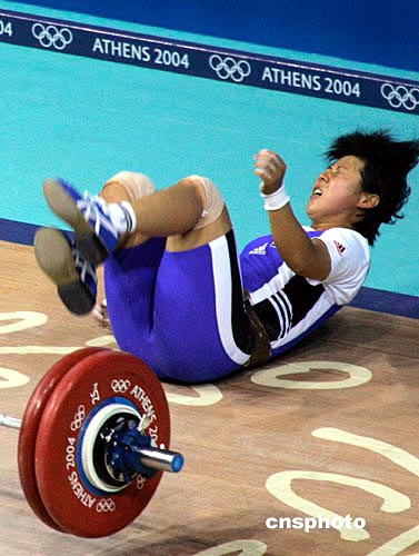 雅典當?shù)貢r間8月16日下午,一名選手在奧運女子58公斤級舉重比賽中失利。中新社記者:張煒