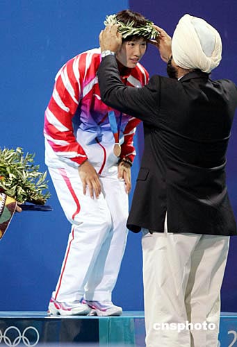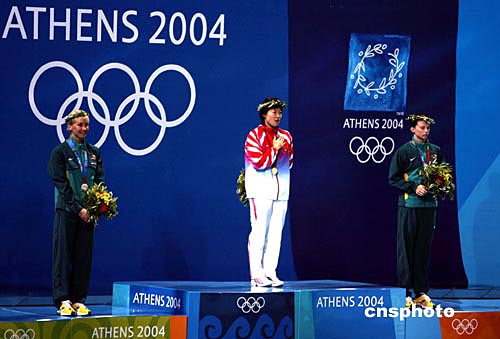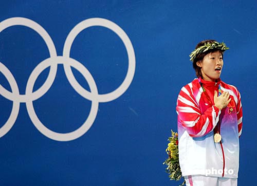 參加雅典奧運會游泳比賽的中國選手極少擁有問鼎獎牌實力者,羅雪娟在當?shù)貢r間八月十六日晚奇跡般奪得女子一百米蛙泳金牌。這是她登上領獎臺最高層,頭戴橄欖桂冠,面對冉冉升起的中國國旗激動得和唱著國歌。中新社記者:任晨鳴
