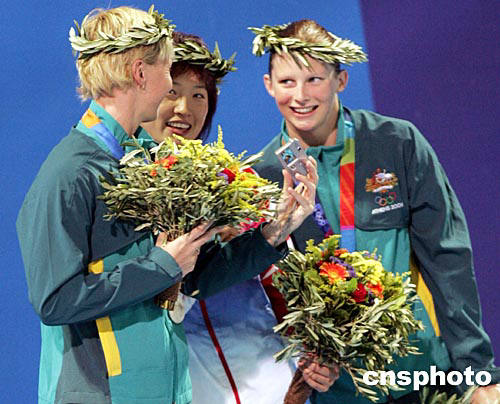 中國選手羅雪娟,雅典當?shù)貢r間八月十六日晚奇跡般奪得第二十八屆奧運會女子一百米蛙泳金牌。這是她在冠軍領獎臺上,頭戴橄欖桂冠,接受獲得第二、第三名的澳大利亞選手祝賀。中新社記者:任晨鳴