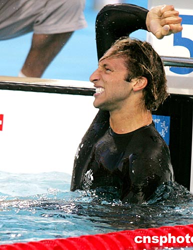 幾乎與第二十八屆奧運會絕緣的澳大利亞飛魚索普,當?shù)貢r間8月16日晚在雅典奧運會男子100米自由決賽中獲得冠軍,再次登上冠軍領獎臺。中新社記者:任晨鳴