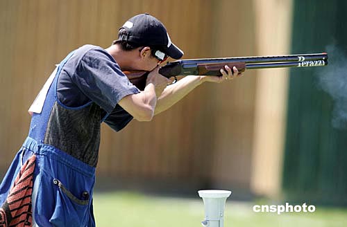 當(dāng)?shù)貢r(shí)間八月十七日,中國(guó)選手王正在雅典奧運(yùn)男子雙向飛碟射擊比賽中獲得銅牌。中新社記者:毛建軍