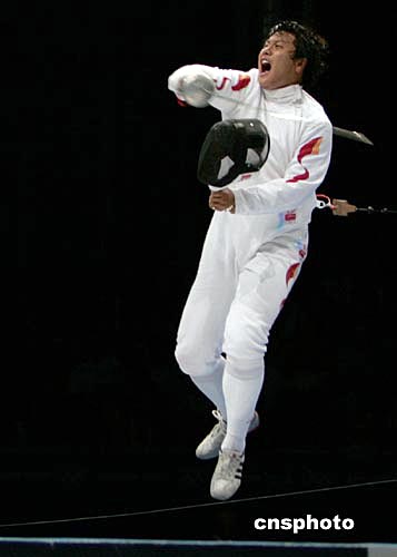 當(dāng)?shù)貢r(shí)間8月17日晚,中國(guó)劍客王磊在雅典奧運(yùn)會(huì)男子重劍半決賽中擊敗俄羅斯選手獲得決賽權(quán)。中新社記者:任晨鳴