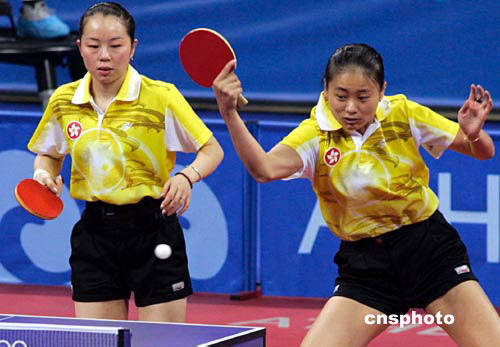 當(dāng)?shù)貢r間八月十八日,在雅典奧運(yùn)會乒乓球女雙1/4決賽中,中國香港選手桑亞蟬、帖亞娜被王楠、張怡寧以2:4淘汰。中新社記者:張煒