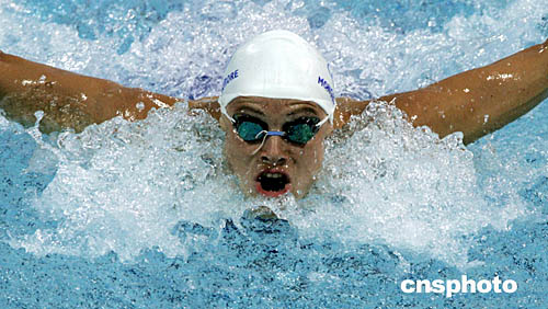 圖為法國選手Aurore Mongel在18日舉行的200米蝶泳的半決賽中如蝴蝶飛起模樣。