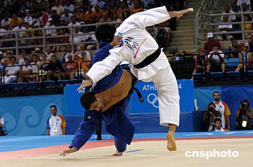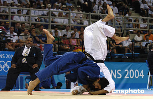 圖為在當?shù)貢r間18日舉行的男子-90公斤級柔道比賽中的場面。選手們不時上演精彩的“武俠大片”。