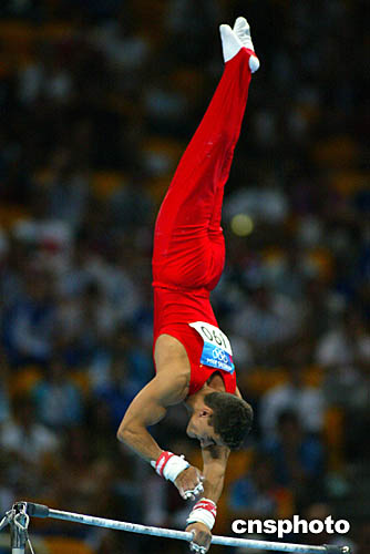 在當?shù)貢r間8月18日舉行的男子體操個人全能決賽中,羅馬尼亞選手Marian Dragulescu上演空中倒立精彩一幕。