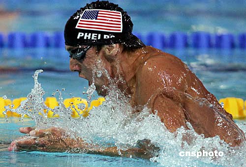 當地時間八月十九日晚,美國超級明星菲爾普斯在雅典奧運男子二百米個人混合泳比賽中贏得冠軍并打破了奧運會紀錄。中新社記者:毛建軍