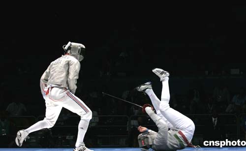 圖為當(dāng)?shù)貢r(shí)間8月19日進(jìn)行的男子擊劍團(tuán)體賽中,獲得冠軍的法國(guó)隊(duì)在決賽中對(duì)陣意大利隊(duì)的場(chǎng)景。