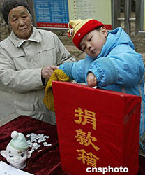 北京一名年僅三歲的幼童在奶奶的陪伴下,將積攢的硬幣一枚一枚地投入社區(qū)的捐款箱,救助印度洋地震海嘯災(zāi)民。