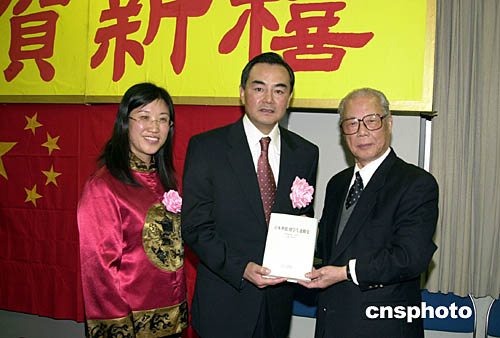 歷經(jīng)十五年編纂而成的六十萬字的僑史力作《日本華僑·留學(xué)生運動史》,日前在東京出版面世。這本凝聚日本僑界心血的歷史專著,填補了在日華僑和留學(xué)生史料的大量空白,獲得各界高度評價。圖為該書主編、著名僑領(lǐng)陳焜旺先生(圖右),在八日于東京舉行的日本僑界迎新聯(lián)歡會上,向王毅大使(圖中)和中國駐日本大使館總領(lǐng)事于淑媛(圖左)贈送該書。作者:王健