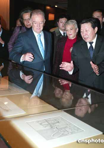 《葡萄牙覓見(jiàn)中國(guó)》展覽一月十三日在北京開(kāi)幕,葡萄牙總統(tǒng)桑帕約(左二)在中國(guó)文化部長(zhǎng)孫家正(右一)陪同下參觀展出的中國(guó)古觀象臺(tái)圖紙。作者:滿會(huì)喬