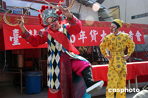 此刻街面上的清凈也絲毫沒(méi)有影響媒體記者的熱情,“二00五臺(tái)北年貨大街開(kāi)幕記者會(huì)”就在消防演習(xí)后在城隍廟前隆重召開(kāi)了。裝扮成美猴王、雞王的演員亮麗出場(chǎng),分別代表去年和新年的“值年星君”授綬帶、傳金寶進(jìn)行交接。一群幼兒園的孩子被這場(chǎng)小演出吸引,拉著老師和猴王、雞王合影,并爭(zhēng)相摸起元寶。閃光燈瞬時(shí)四起,捕捉著這些孩子天真可愛(ài)的笑容。