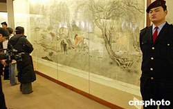 近日,重張開業(yè)的北京懋隆藝術(shù)館,展示館藏精品《柳林十駿圖》,該圖長(zhǎng)523cm,寬256cm設(shè)色絹本,由張善仔、張大千合作而成,是迄今張氏兄弟合作繪制的最大畫作,極具鑒賞與收藏價(jià)值。中新社記者:錢興強(qiáng)