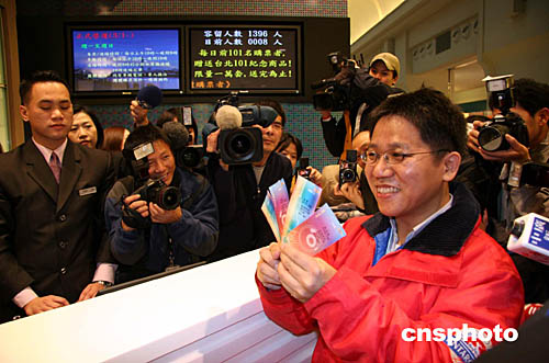 正式售票的半小時(shí)前,臺(tái)北一O一大樓觀景臺(tái)在五樓舉辦了“祥獅獻(xiàn)瑞”慶;顒(dòng),兩頭生動(dòng)活潑的紅色醒獅為排隊(duì)等候買票的觀眾和媒體作了精彩表演,觀景臺(tái)經(jīng)理季正杰隨后為售票開鑼。(完)
