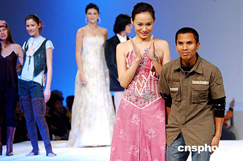 1月20日,在“香港時裝節(jié)秋冬系列”及“香港國際時尚薈萃”上,舉辦一場國際時裝設(shè)計師表演,圖為印度尼西亞時裝設(shè)計師A.Sofiyulloh與名模楊崢登臺謝幕。作者:洪少葵