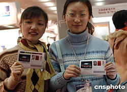 | 兩名北京女青年一月二十日上午來到北京國貿(mào)中心展館,在“第三屆北京國際體育基礎(chǔ)設(shè)施和場館技術(shù)展覽會(huì)”金牛直通自助售票機(jī)前,各自模擬定購了附有自己快照的2008年(8月8日20:00時(shí))北京奧運(yùn)會(huì)開幕式----國家體育館漂亮的觀眾票,模擬票價(jià)在千元以上不等。此次展會(huì)匯聚了國內(nèi)外眾多著名電子服務(wù)和場館技術(shù)企業(yè)。中新社記者:鄒憲