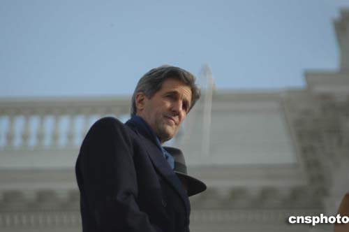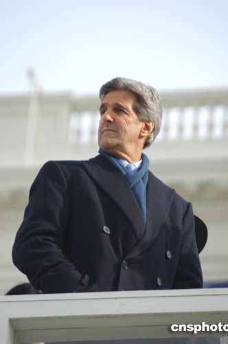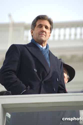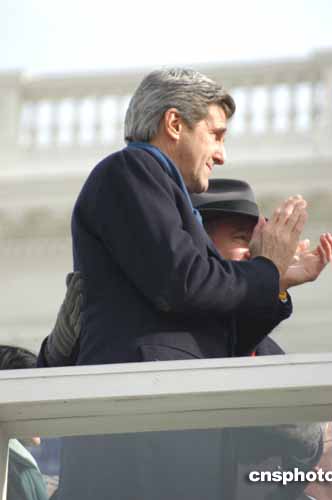在去年底美國大選中敗給布什的民主黨參議員克里20日參加了布什就職典禮,坐在布什演講臺左側(cè)的第七排。在整個儀式過程中,克里表情嚴肅,神情落寞。當(dāng)布什宣誓完畢,全場歡呼時,克里有禮貌地鼓掌,他身旁的另一位嘉賓拍拍他的后背,似在安慰克里。作者:余東暉