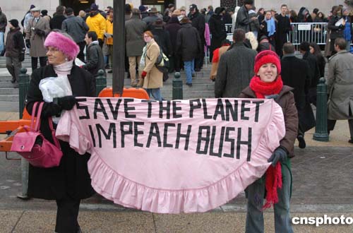當(dāng)?shù)貢r間一月二十日,在美國總統(tǒng)布什就職典禮場外,一些示威者抗議布什當(dāng)政,要求彈劾總統(tǒng)。作者:余東暉
