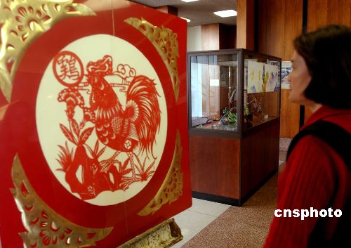 中國傳統(tǒng)農(nóng)歷雞年藝術(shù)品一月開始在美國洛杉磯阿罕布拉市政廳展出,這里已成為華人新移民聚居的城市。作者:賈國榮